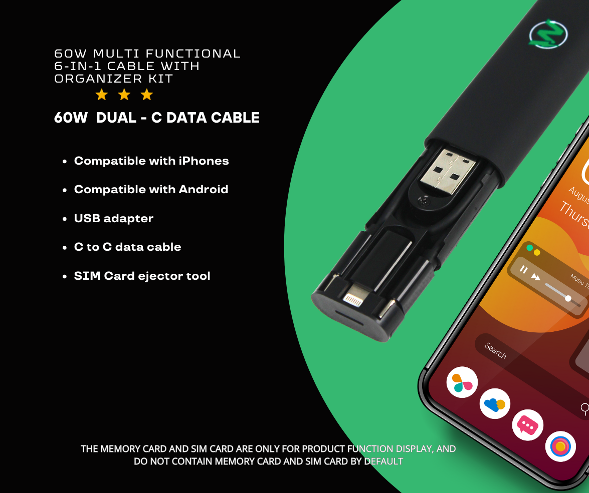 Buy 60W multi‑function USB‑C cable set with organizer box in Pakistan – includes USB‑A, Lightning, Micro adapters, SIM slots, and 60W power. Top travel tech of 2025. Cash on delivery anywhere in Pakistan