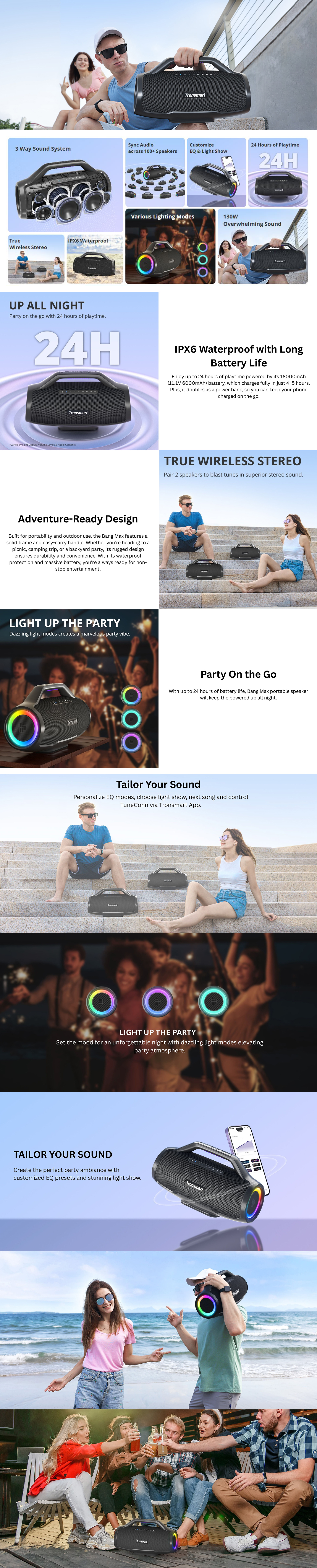 Equipped with Bluetooth 5.3 technology, the Bang Max offers a lightning-fast and stable connection to your smartphone, laptop, or any Bluetooth-enabled device. Take full control with the Tronsmart APP, where you can customize EQ settings, adjust reverb, and personalize light effects. It also supports TF card and U-disk playback, giving you multiple ways to enjoy your music.