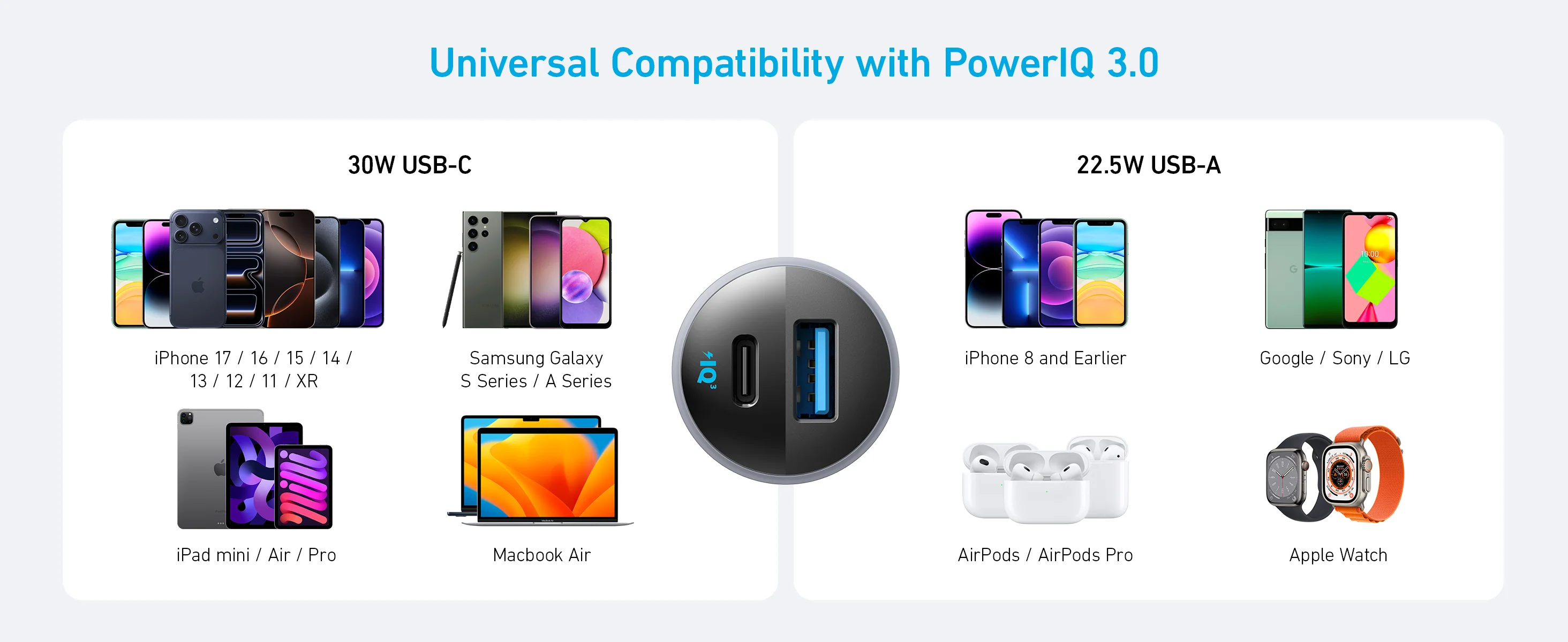 Thanks to Anker PowerIQ 3.0 technology, this car charger offers smooth and stable compatibility with a wide range of devices. From iPhone 15 series, Samsung Galaxy S23/S22, Google Pixel, to USB-C tablets and other smart devices, it adapts power intelligently for optimal charging.