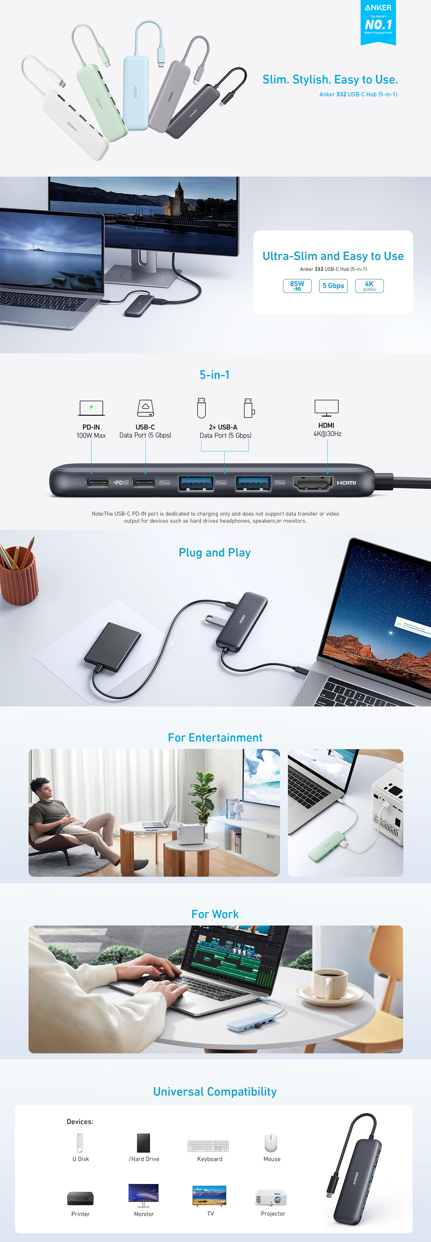 85W Pass-Through Charging: Power your laptop while using the hub; ideal for MacBook Pro, MacBook Air, Dell laptops, and more (charger not included).