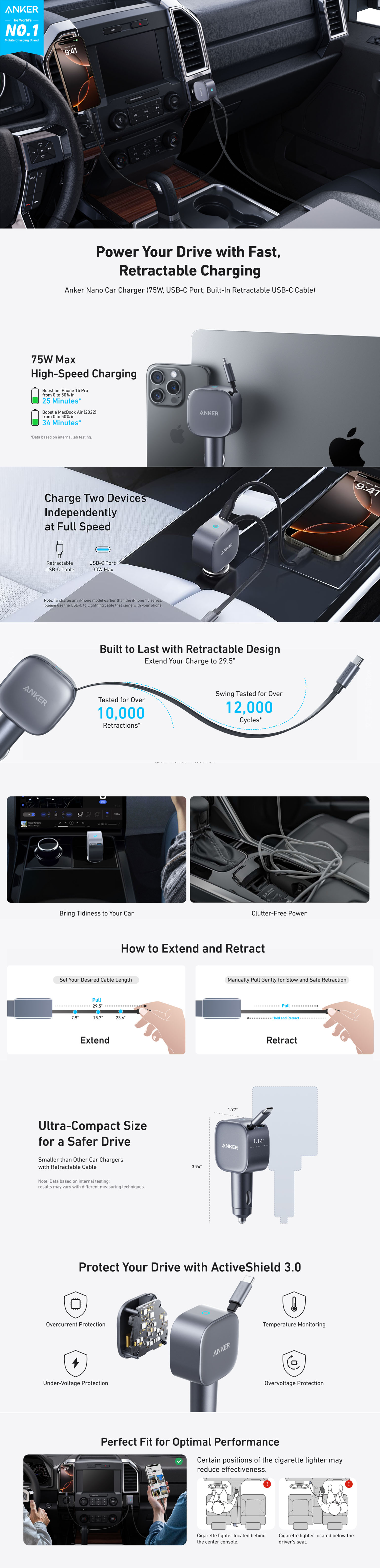 75W Max Fast Charging: Delivers powerful and ultra-fast charging for phones, tablets, and laptops while driving.
