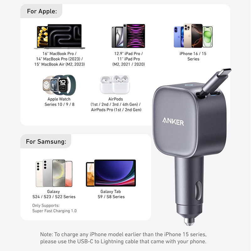 Compatible with iPhone 15 / 14 series, Samsung S24 / S23, MacBook Pro & Air, iPad, and many other USB-C devices, making it a versatile car charger for everyday use.