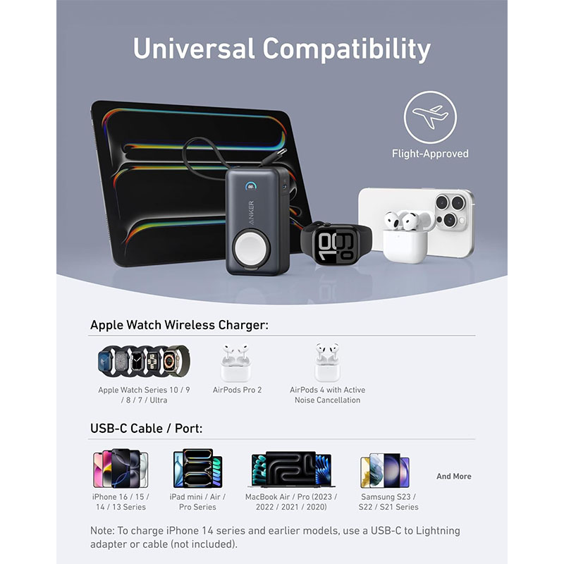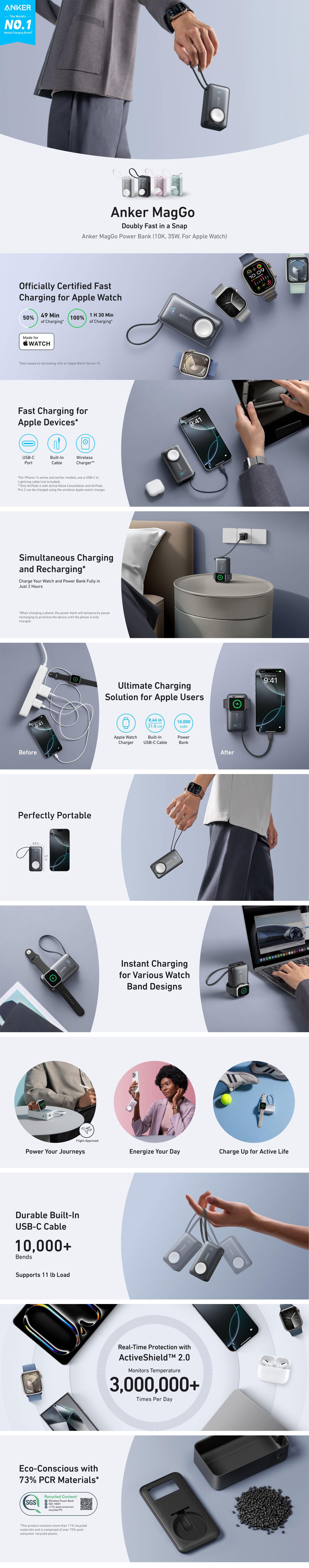 This smart power bank features an adjustable Apple Watch magnetic charger along with a built-in USB-C cable, allowing you to charge multiple devices effortlessly. From Apple Watch to iPhone, iPad, AirPods, and even Samsung devices, Anker MagGo keeps all your essentials charged on the go.