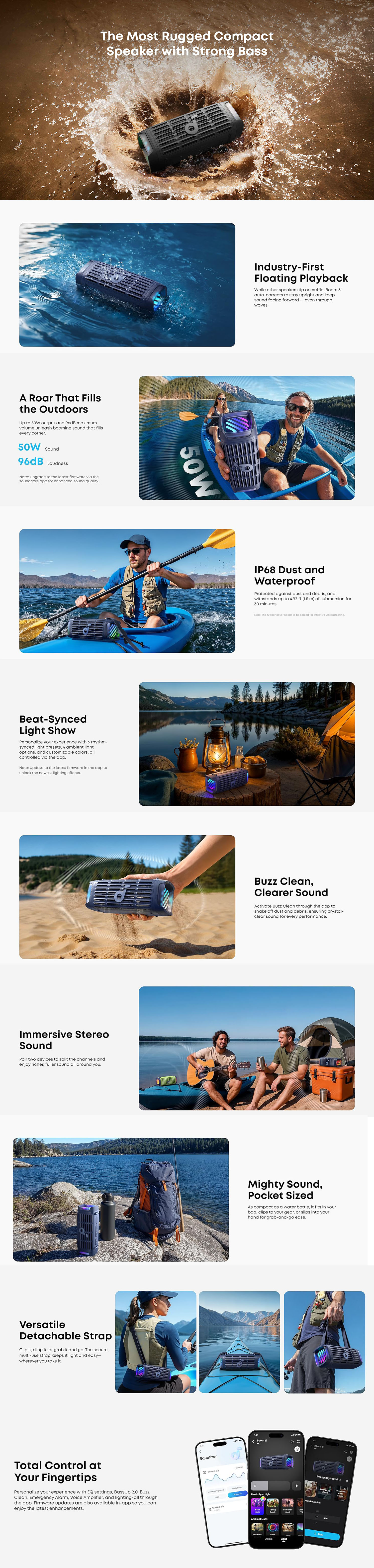 With a water-bottle-size design, the Soundcore Boom 3i fits easily into backpacks, clips to gear, and sits comfortably in one hand—perfect for grab-and-go adventures.