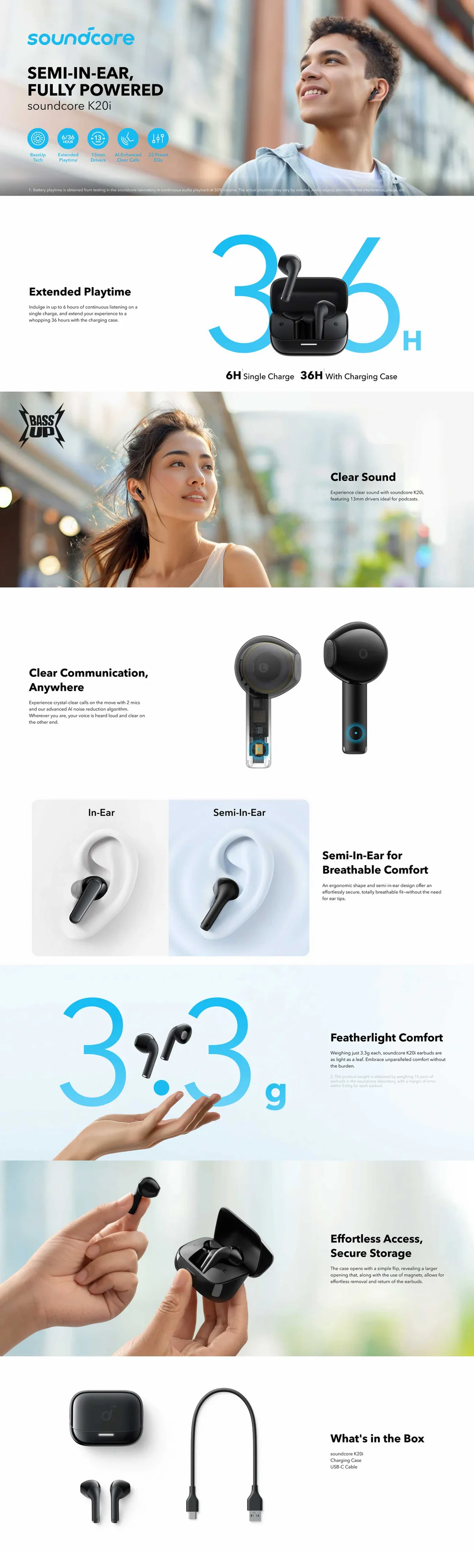 Equipped with a 13mm dynamic driver and advanced BassUp technology, the Soundcore K20i delivers clear audio with enhanced bass. Whether you're listening to music or podcasts, expect rich and balanced sound quality.
