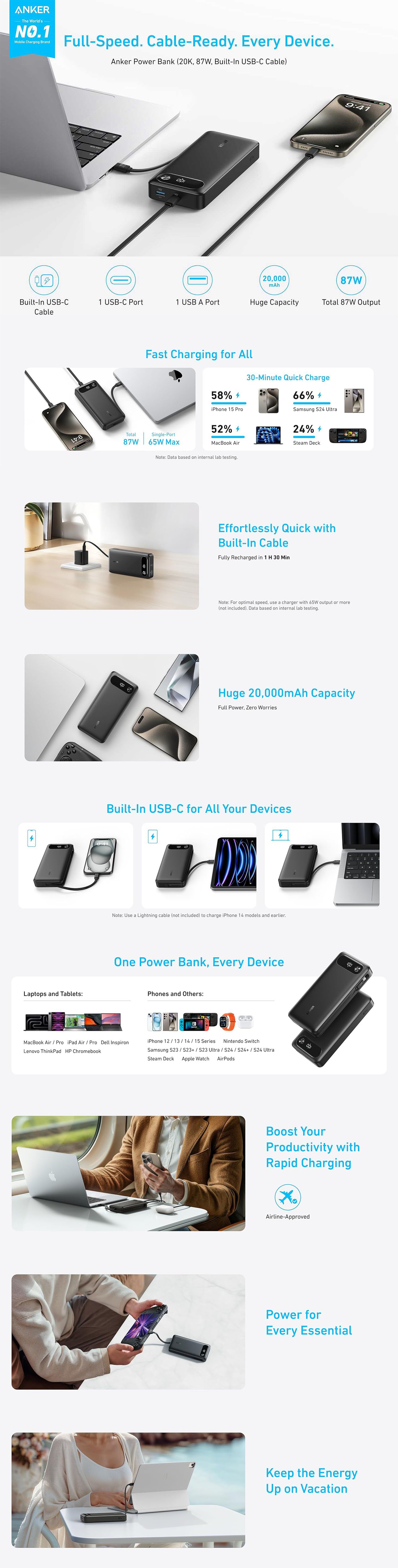 Built-In USB-C Cable: Quickly power iPhone 15 Pro to 58% or MacBook Air to 52% in just 30 minutes.