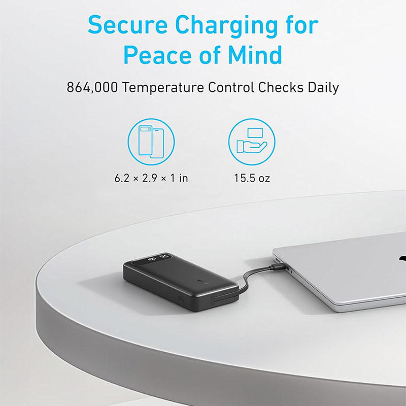 Anker 20,000 mAh Power Bank Travel Essential Portable Charger with Built-in USB-C Cable, 3-Port 87W Max Fast Charging Battery Pack, for MacBook & Phones - Black