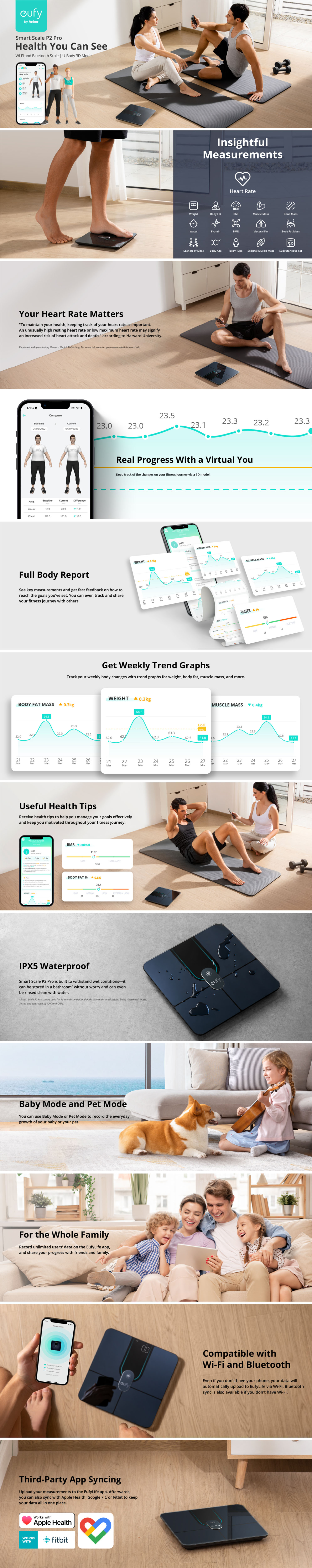 For added convenience, the scale supports third-party fitness platforms such as Apple Health, Google Fit, and Fitbit, allowing you to keep all your health data in one place. Designed for the whole household, it supports unlimited users and includes baby and pet modes, so everyone in the family can monitor healthy growth and wellness with ease.