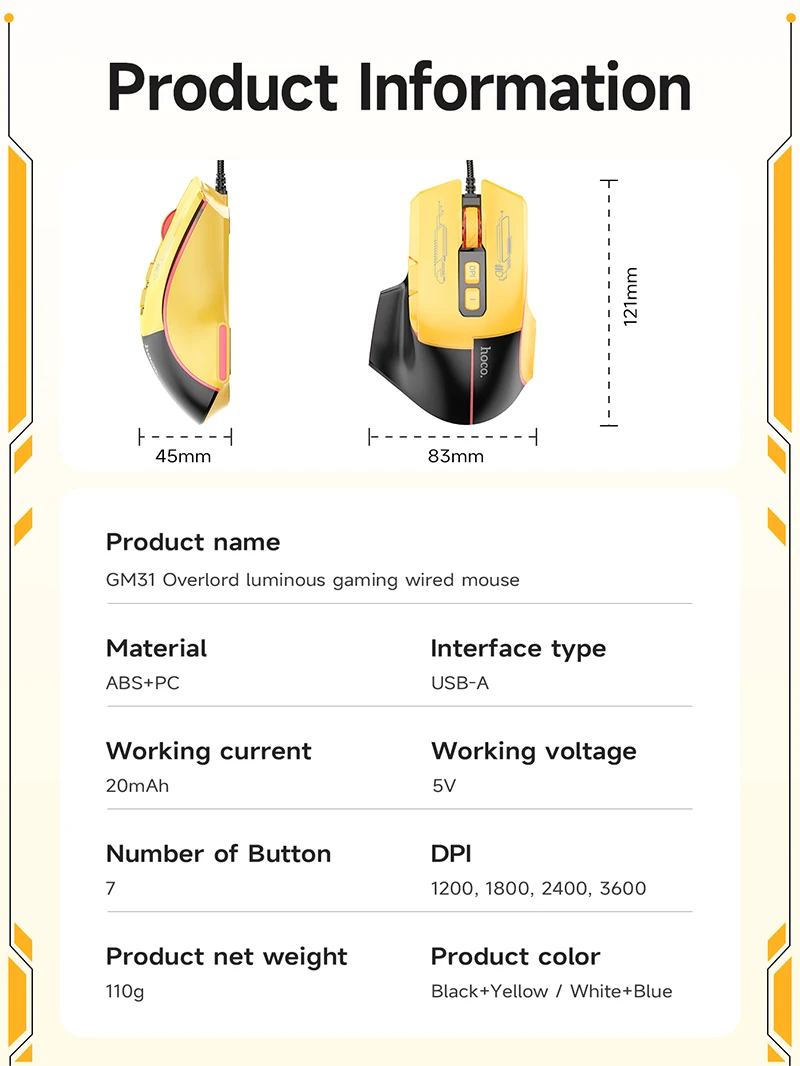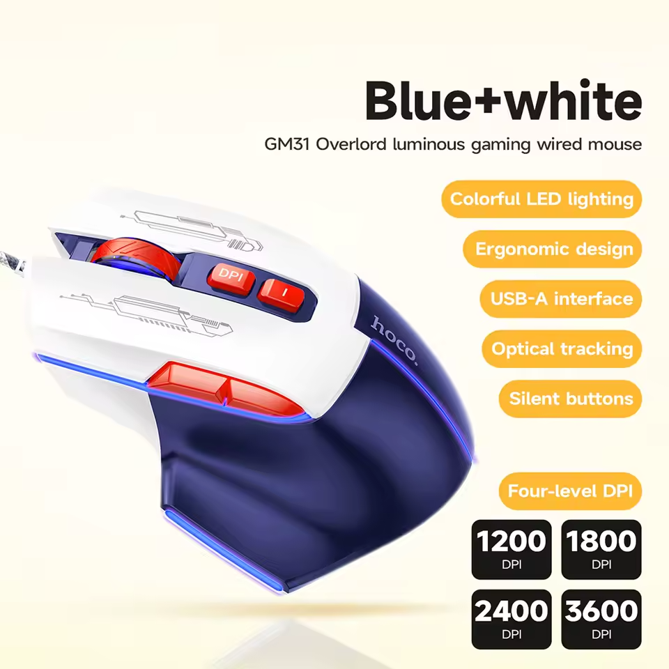 Elevate your gaming setup with the Hoco GM31 Overlord Wired Gaming Mouse. Featuring adjustable 3600 DPI precision, 7 programmable buttons, and striking RGB breathing lights, it delivers professional-grade control. The perfect budget-friendly, high-performance optical mouse for PC gamers across Pakistan.