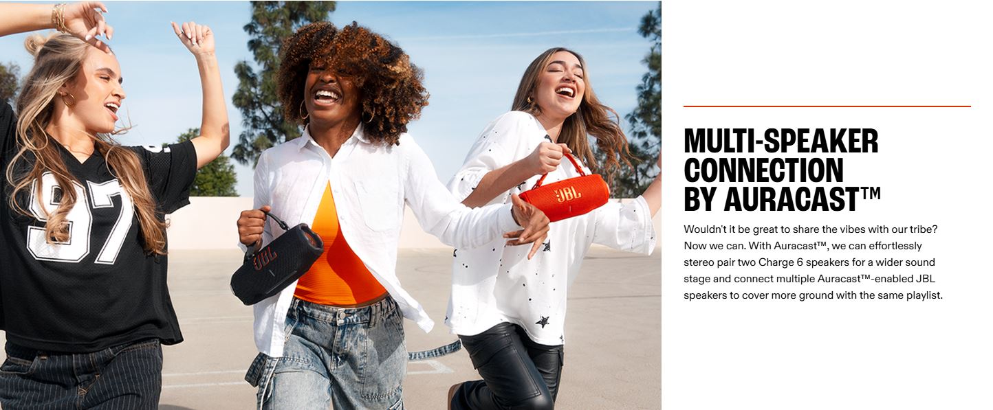 Turn your solo listening session into a crowd-pleasing event. With Auracast™ technology, you can stereo pair two Charge 6 speakers for immersive sound or connect multiple JBL Auracast™-enabled speakers to cover a larger area. Whether it’s a rooftop party, backyard barbecue, or sports gathering, the Charge 6 makes sure everyone feels the music.