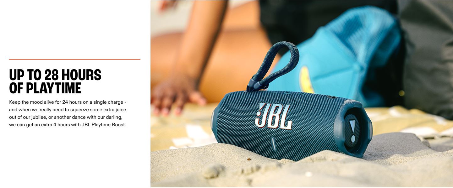 Music doesn’t stop, and neither does the JBL Charge 6. Enjoy up to 24 hours of playtime on a single charge, perfect for long trips, parties, or all-day listening. Need a little extra? Activate JBL Playtime Boost to squeeze out an additional 4 hours, giving you a total of 28 hours of uninterrupted entertainment.