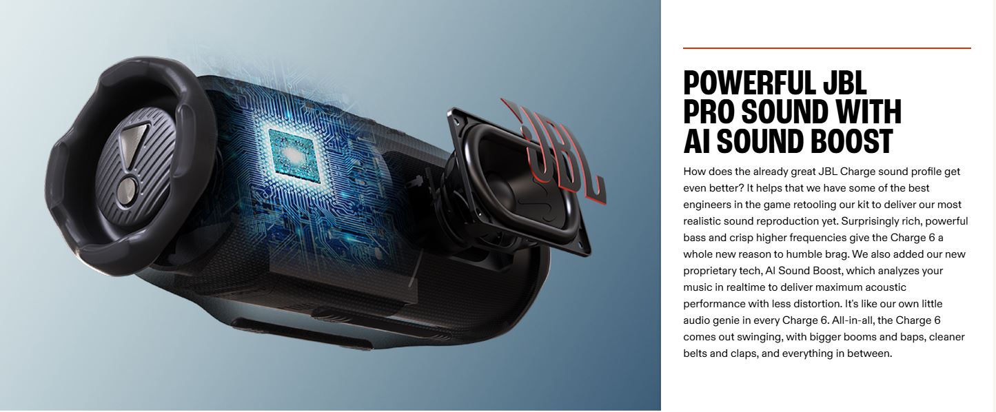 The JBL Charge 6 takes everything you love about its legendary sound profile and makes it even better. With the expertise of world-class audio engineers, this portable speaker delivers richer bass, crisp highs, and balanced mids for the most realistic sound yet. JBL’s exclusive AI Sound Boost technology analyzes your music in real-time, optimizing acoustic performance and reducing distortion. The result? Every beat, clap, and lyric hits harder and cleaner—like having a personal audio genie inside your speaker.