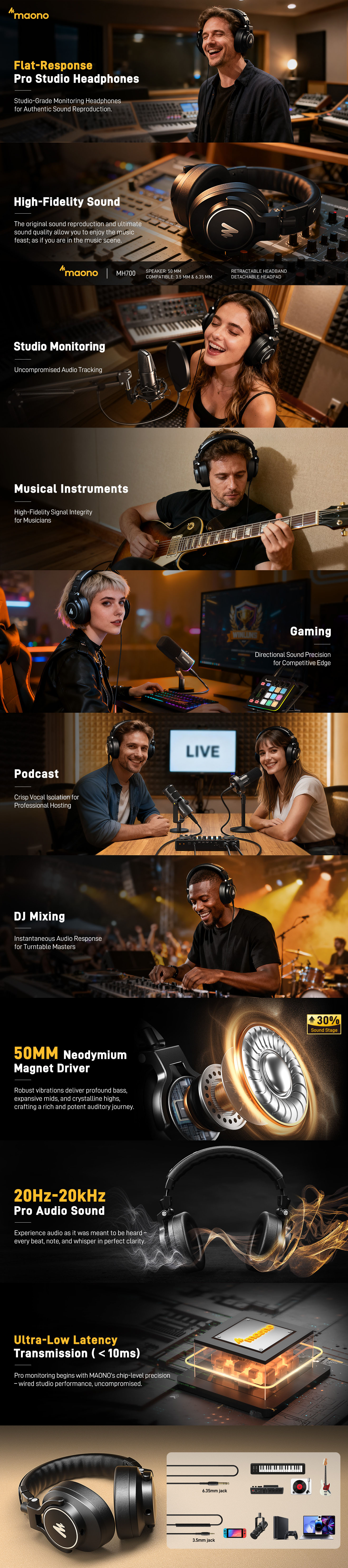 Equipped with premium 50mm dynamic drivers, the MAONO MH700 produces rich stereo sound with perfectly balanced highs, mids, and deep lows. With a wide frequency response of 20Hzā20kHz, you can hear every detail with precision, making it ideal for studio recording, mixing, DJing, and music production.