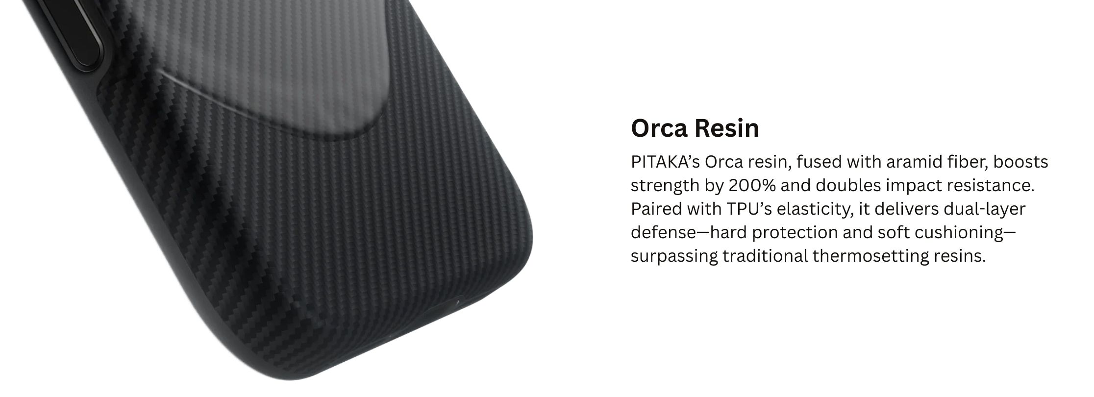 PITAKA’s exclusive Orca Resin, fused with aramid fiber, boosts overall strength by 200% and doubles impact resistance. Combined with flexible TPU, it creates a dual-layer defense system—hard outer protection with soft inner cushioning—outperforming traditional thermosetting resin cases.