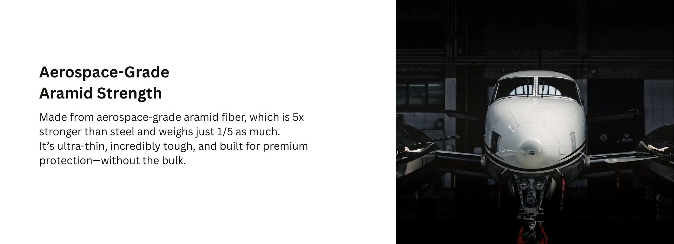 Crafted from aerospace-grade aramid fiber, the same material used in aircraft and bulletproof gear.