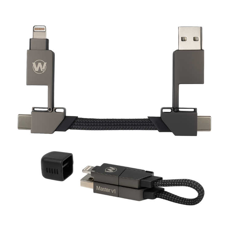The Master v1 Survivor Ring Cable by W stands out as a heavy-duty, all-in-one cable designed for maximum convenience and durability. Built with premium braided nylon and reinforced connectors, it’s engineered to handle rough use while maintaining excellent performance. The innovative ring-style organizer keeps your cables neatly arranged and tangle-free, making it ideal for travel and everyday portability. With universal compatibility — including USB-C, USB-A, and Lightning connectors — this 6-in-1 cable functions both as a fast-charging and data-transfer cable, covering all your device needs in one smart design. Whether you need to charge your iPhone, iPad, Android device, laptop, or any other gadget, the Master v1 Survivor ensures reliable and lightning-fast charging every time.