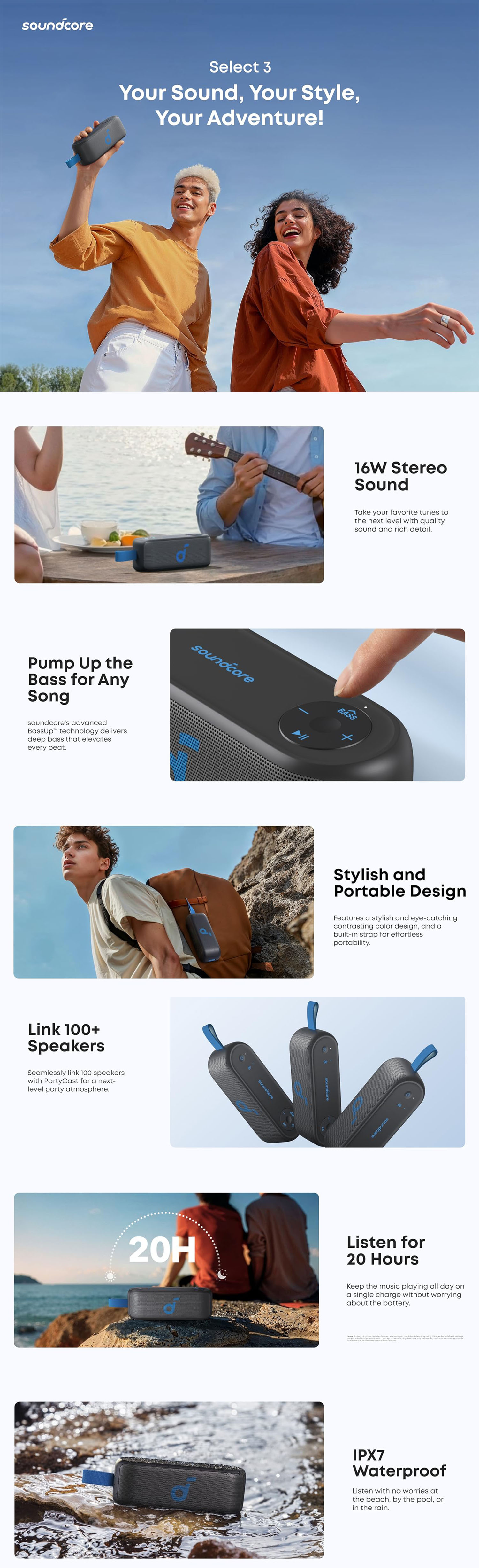 Whether you’re hiking, camping, or relaxing with friends, the Soundcore Select 3 Portable Speaker delivers reliable performance, powerful sound, and durable protection wherever you go.