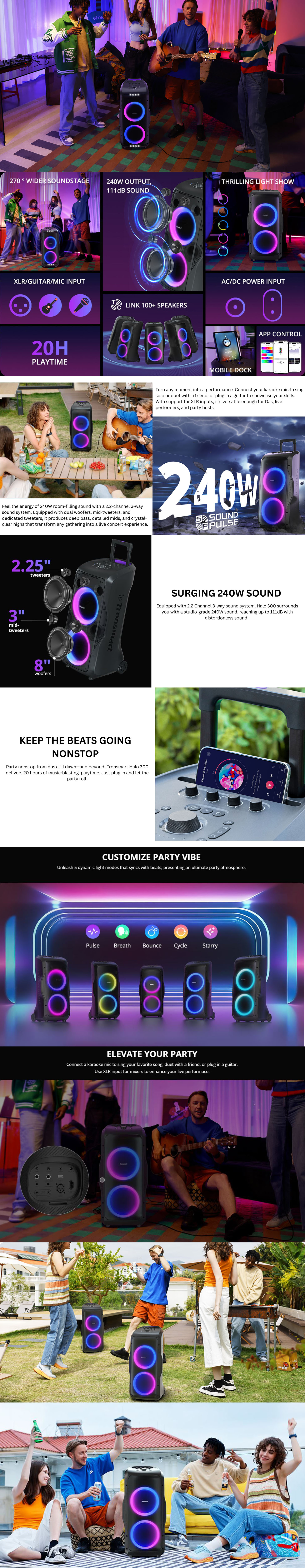 Buy the Tronsmart Halo 300 Portable Wireless Speaker in Pakistan and enjoy 240W surging sound, 270° wide soundstage, 20H battery life, mic & guitar input, and ultimate portability with handle and wheels – perfect for parties and outdoor events.