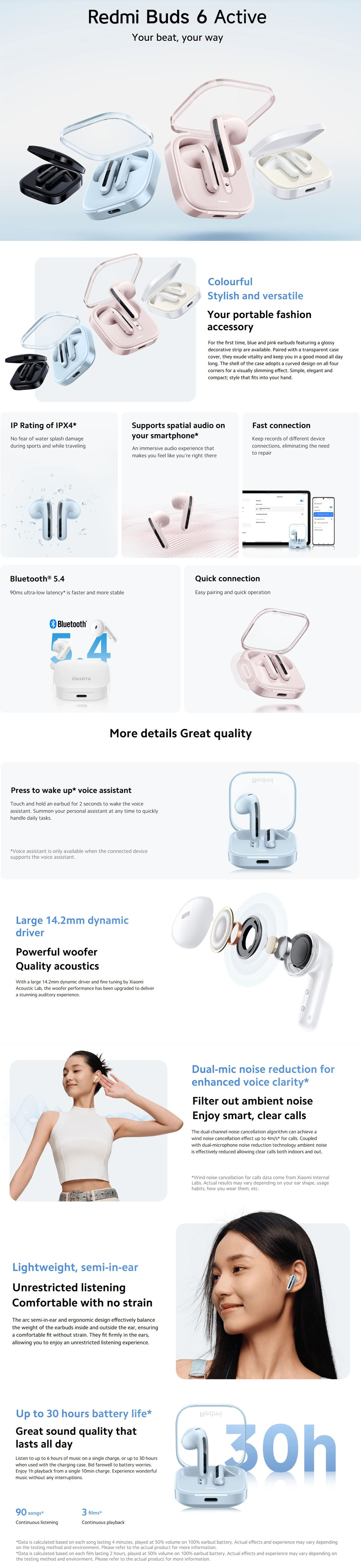 Buy Xiaomi Redmi Buds 6 Active True Wireless Earbuds in Pakistan with Bluetooth 5.4, 30H long battery life, clear call noise cancellation, 5 tuning modes, and IPX4 water resistance. Perfect for music, calls, and daily use with premium sound quality and comfort.
