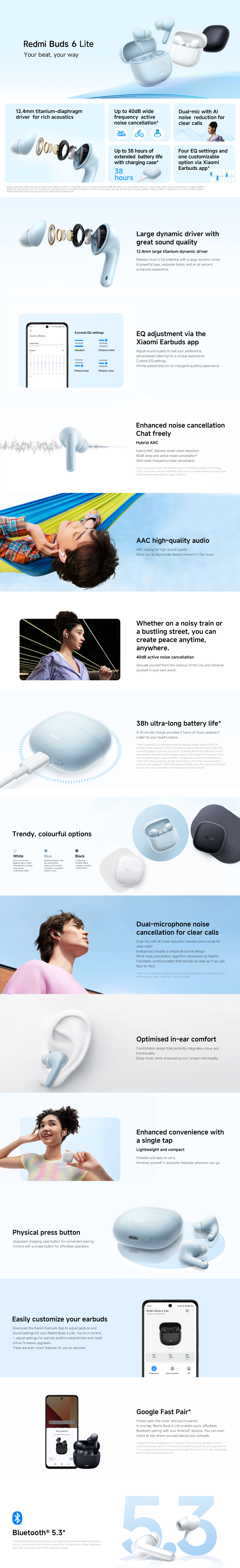 Experience powerful sound and next-level comfort with the Xiaomi Redmi Buds 6 Lite. Designed for everyday use and workouts, these true wireless earbuds deliver immersive audio, smart noise cancellation, and long-lasting battery life to keep you connected all day.
